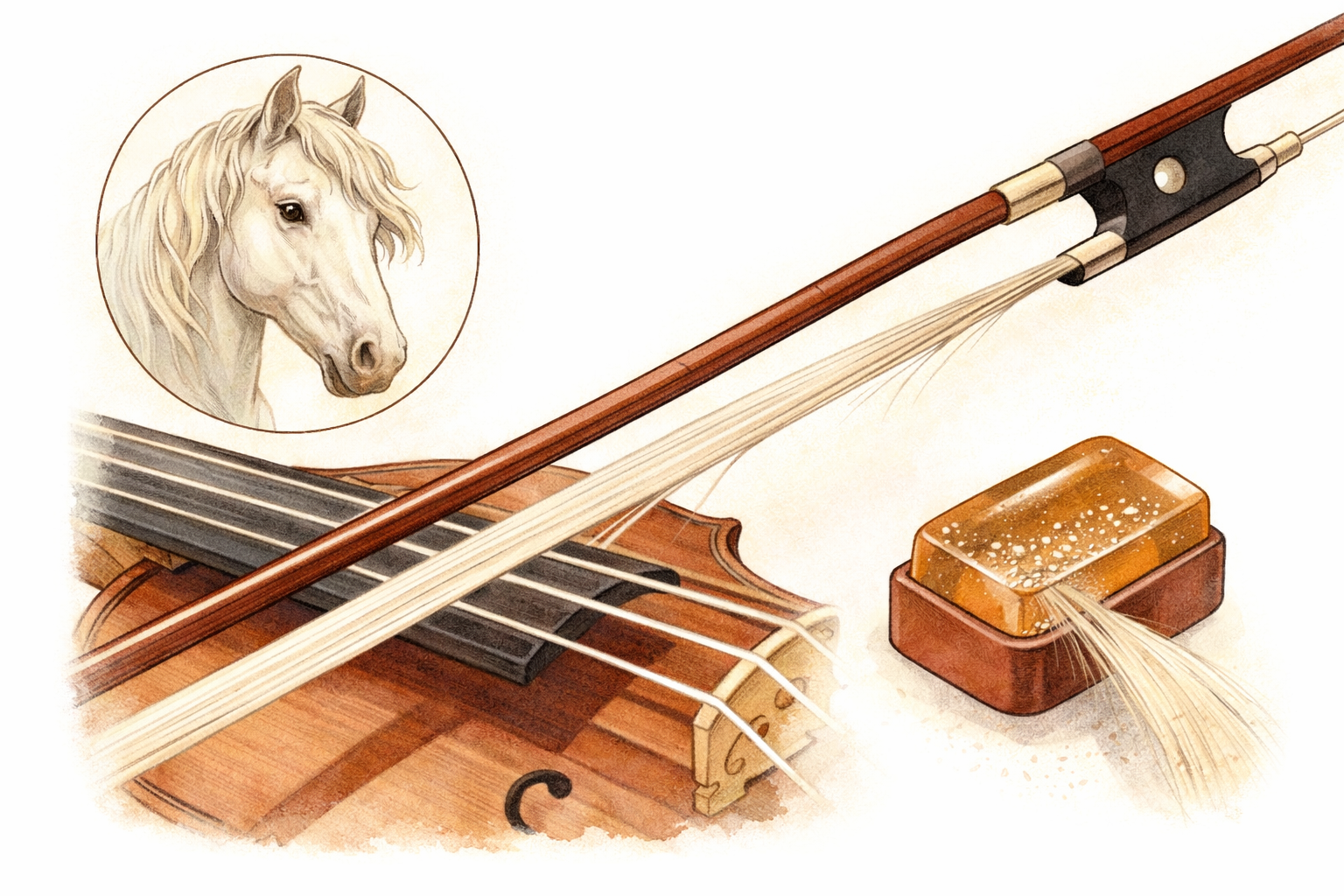 ・白馬の毛は表面がやや粗く、松脂が付きやすいため好まれます